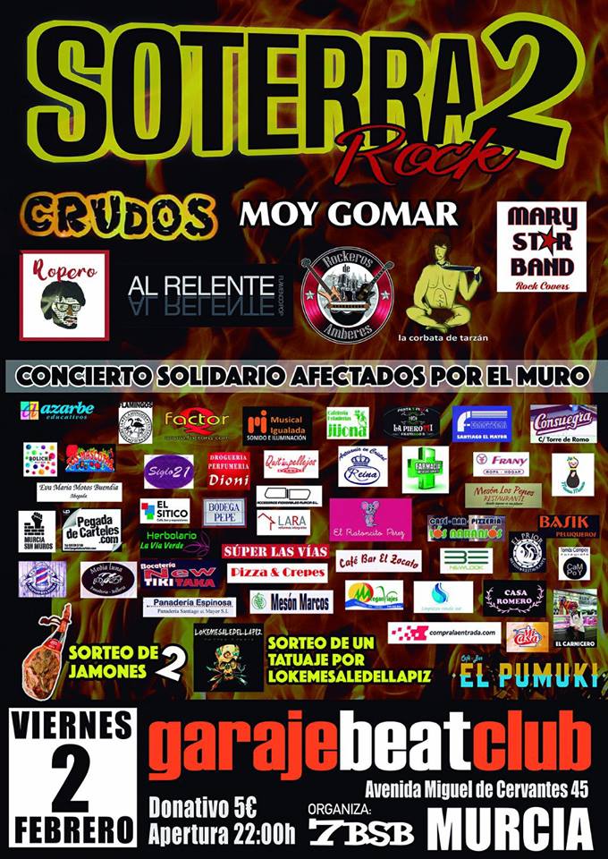 Segunda edición del festival solidario Soterra Rock el 2 de Febrero en la sala Garaje Beat Club de Murcia con El movimiento vecinal Pro-Soterramiento nace a consecuencia de las promesas incumplidas por parte de las instituciones locales y estatales sobre el soterramiento de las vías existentes que parten los barrios del sur de Murcia, generando desigualdad con respecto a los barrios del norte. Ante las constantes manipulaciones y desvío de fondos públicos, los vecinos de los barrios afectados se han organizado para reivindicar su derecho a una ciudad sin un muro que les separe del resto de la urbe. El Gobierno ha respondido a las movilizaciones ignorando sus demandas y reprimiendo con violentas cargas policiales, arrestos a dedo y sanciones económicas a aquellos que se resisten a esta imposición ilegítima, motivo por el cual los vecinos están llevando a cabo diversas iniciativas con el fin de recaudar fondos para costear las sanciones y gastos judiciales de los afectados. Entre estas acciones está este festival, Soterra Rock, en el que siete grupos murcianos comprometidos con su ciudad pondrán su música al servicio de la causa, gritando muy alto NO AL MURO.