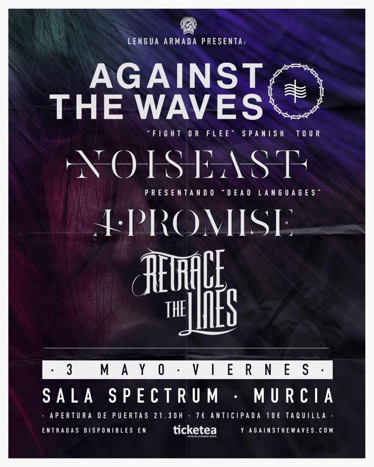 Junto a ellos tendremos también a los mallorquines Noiseast, presentando su último trabajo titulado Dead Languages. Los murcianos ya míticos dentro de la escena de la región, A Promise, desaparecidos de los escenarios por un tiempo, vuelven a ellos con las pilas cargada a tope para darles una gran a cogida al resto de bandas de la noche. Y por último pero no menos importante, Retrace the Lines desde Valencia, los cuales llevaban un tiempo sin visitar la ciudad.
