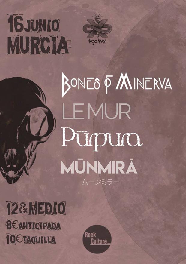 Los madrileños Bones of Minerva traen a Murcia su muy personal propuesta de metal alternativo, un auténtico torbellino sobre el escenario. Le Mur vuelven a la sala 12 y medio donde presentaron su álbum junto a Jardín de la Croix y Bad Cassidy (crónica Le Mur, Jardín de la Croix y Bad Cassidy) para cerrar esta etapa que les está llevando a ciudades como Madrid, Vigo, Barcelona (Tótum Revolútum 4.0) o Valencia. Desde Valencia llegan Pürpura para presentar su disco debut que les ha llevado a girar por Europa y aparecer en los carteles de festivales de la talla del Booster Fest o el Resurrection Fest. Cierran la propuesta los también murcianos Munmira con una propuesta sin complejos, sin atarse a un estilo en concreto; con unos músicos que se crecen cada vez que suben a un escenario tal y como pudimos ver en la presentación de su último disco.