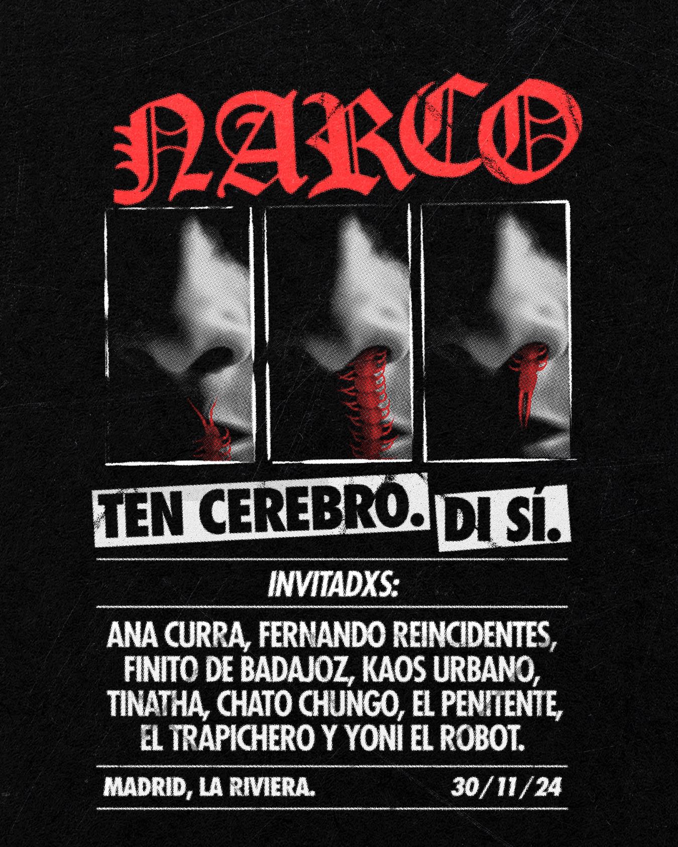El próximo 30 de noviembre, la banda sevillana NARCO pondrá en Madrid el punto final a la exitosa gira PARASITOUR, que les ha llevado por numerosísimos escenarios a lo largo y ancho de la geografía nacional. Pero la cita del 30 de noviembre en la Sala La Riviera de la capital madrileña no será un concierto más, Narco quiere que sea un gran espectáculo y una gran fiesta para los amantes de su música, y para ello contarán con la presencia de muchos compañeros de escenario como Fernando de Reincidentes, Kaos Urbano, Ana Curra, Finito de Badajoz, Tinatha, Chato Chungo, El Penitente o El Trapichero.