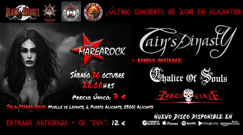 El próximo sábado 20 de octubre la banda alicantina de power metal Cain´s Dinasty dará su último concierto de 2018 en Alicante. Tendrá lugar en la sala Marearock del puerto de Alicante, y podremos escuchar temas de su cuarto disco Eva, editado en este 2018.