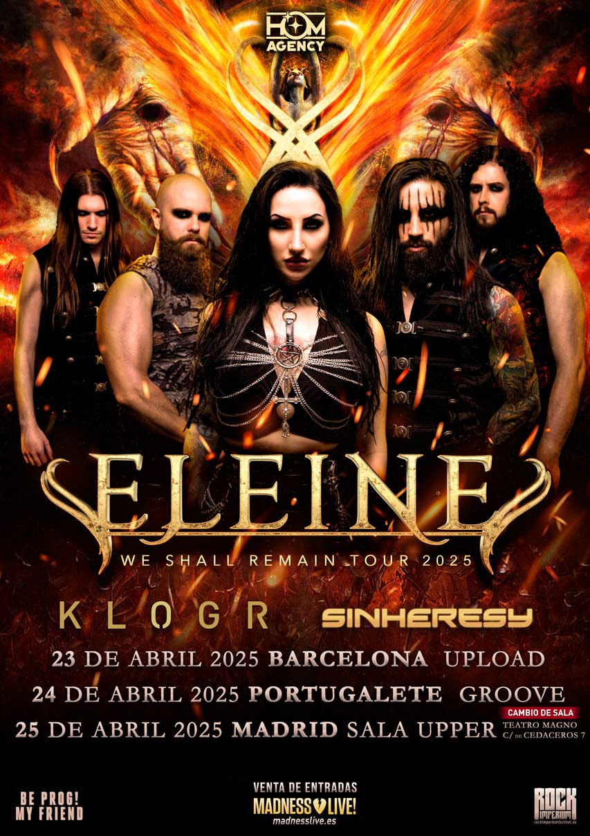La banda sueca de metal sinfónico ELEINE, liderada por la magnética Madeleine Liljestam, continúa su esperada gira por España junto a los italianos Sinheresy y Klorg. Esta potente combinación de bandas promete una noche de metal melódico y alternativo de alto nivel.