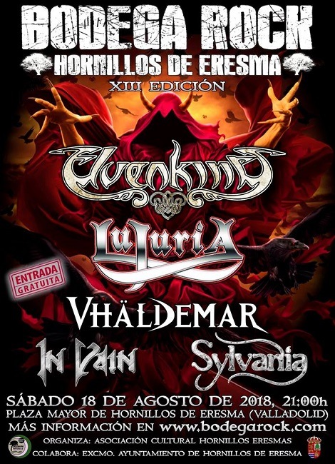 El festival Bodega Rock nació en 2004 de manos de la Asociación Cultural Hornillos Eresmás. Esta decimotercera edición, que vuelve a ser gratuita, estará encabezada por el grupo italiano de folk metal Elvenking que presentarán en el festival nuevo y décimo disco de estudio publicado a finales de 2017. El cartel lo completan Lujuria, Vhaldemar, In Vain y Sylvania.