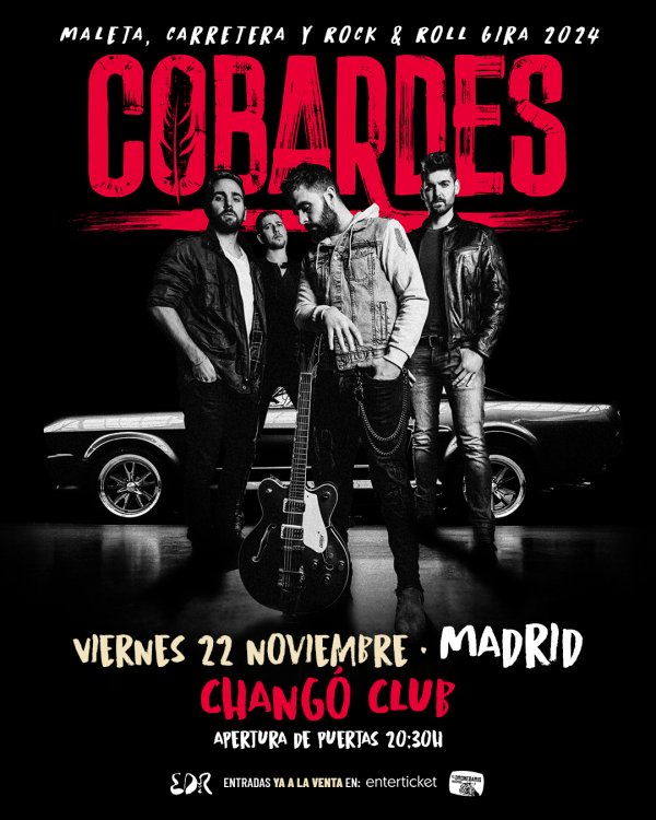 La banda de rock revelación de este 2024, los navarros COBARDES, actuarán en la Sala Changó de la capital el próximo viernes 22 de noviembre. La gira Maleta, Carretera y Rock & Roll que les ha llevado a actuar por gran parte de la geografía nacional, llega a su fin, y su penúltima parada tendrá lugar en Madrid, dejando para casa la última cita, que será en Burlada el 14 de diciembre. El rock de la escuela navarra está de moda, y lo demuestran sus dos últimas actuaciones en Bilbao y Santander, donde agotaron el papel, cosa que está a punto de pasar en Madrid. Así que si quieres ver en directo a una banda de rock con un sonido característico y contundente, no lo dejes pasar porque te puedes quedar sin entrada.