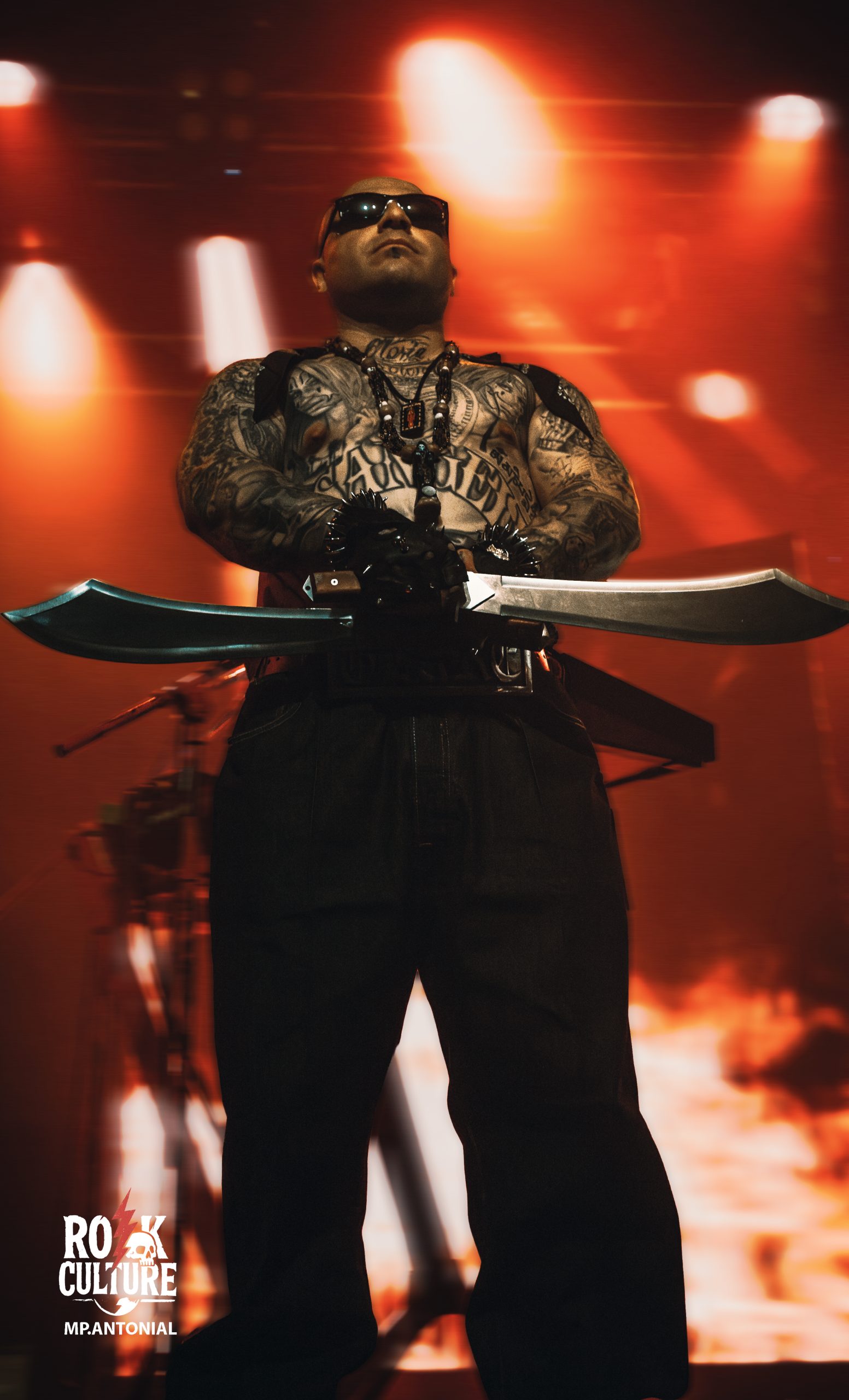 Al llegar a la sala, lo primero que vi fue como la luz roja teñia el escenario mientras Leafar Seyer, cantaba Edge Of The Blade A su lado, dos hombres tatuados sostenían machetes como si fueran sus escoltas. A lo largo del set iban cambiando de posición, como parte de una especie de performance silenciosa. Llevaban collares de la Santa Muerte, cinturones de balas… todo muy en sintonía con la estética ritualista de Prayers.