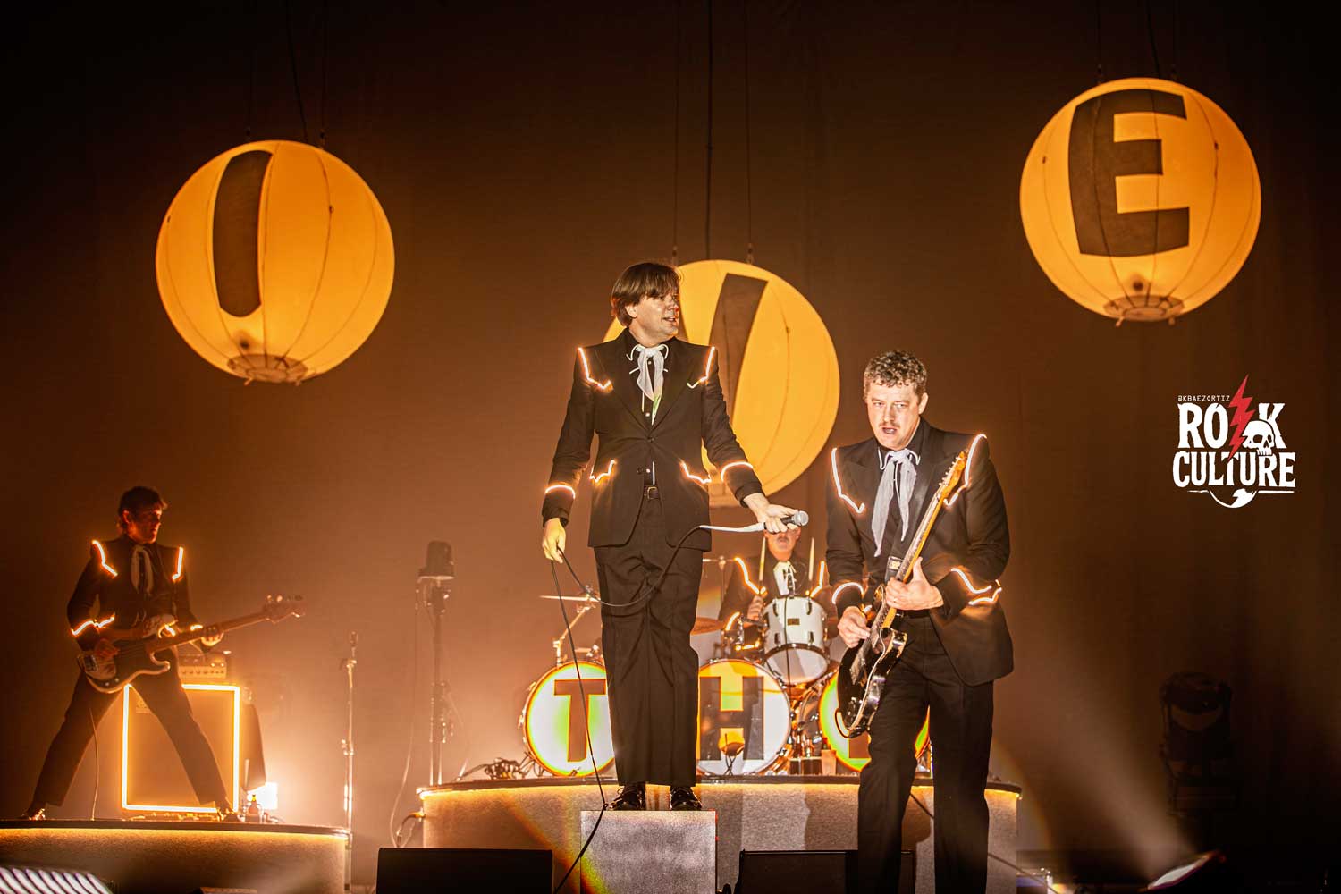 Sobre las 21:35 dio inicio el show. El escenario tenía una vibra minimalista y cálida: varios globos de luz suspendidos formaban el nombre de la banda letra por letra, y en la batería se leía un discreto “THE”. Todo estaba en silencio y vimos a la banda entrar vestidos con trajes que emitían un parpadeo de luz cálida. El contraste era curioso: un aire clásico, elegante y formal, mezclado con un toque moderno gracias a las luces integradas en la ropa. Una estética claramente suya, que mezcla lo tradicional con esa escencia tan british.