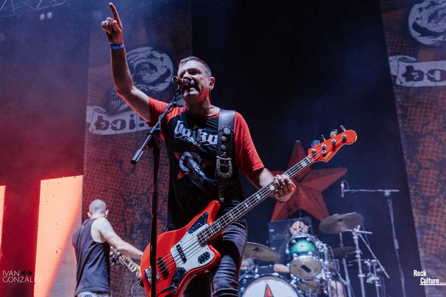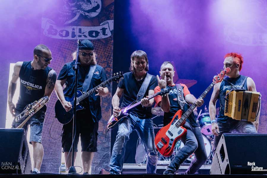 Por fin comenzaba a caer la noche y se reflejaban sonrisas teñidas de rojo por todo el festival. Para muchos, este era el plato principal del evento y venían preparados a darlo todo. Sonaban los tambores, marcando el paso de la puesta en escena de la banda y antes de que pudiera incorporarse el acordeón la gente ya reconocía el principio de Jarama. Siguiendo con Inés, Naita na (Hava Maguila) y Sin tiempo para respirar, Boikot deja claro desde el principio que quieren ver al público cantar. En preparación para Alma Guerrera, Ni Una Menos, las luces rojas que habían iluminado el recinto se tornaron violetas y momentáneamente se hizo el silencio.