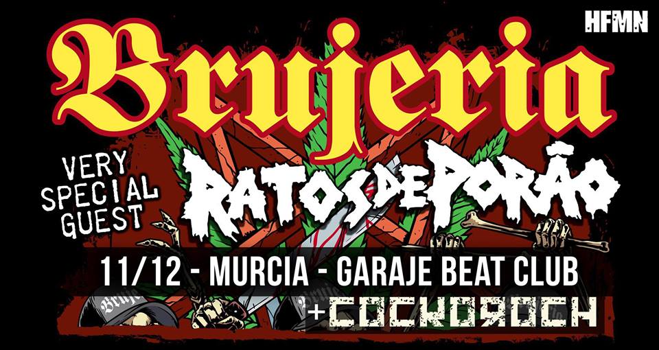 Brujería estarán aquí en plena gira al rededor del mundo que los vuelve a traer tras su ultimo disco Pocho Aztlan, que salió a la luz el pasado año 2016. Descargarán sobre el escenario toda su artillería cargada de muerte, violencia, podredumbre y venganza con su característico y salvaje grindcore y death metal. Vendrán bien acompañados junto a los brasileños Ratos de Porao con su bestial hardcore punk. Pero primeramente tendremos la actuación de nuestros ya conocidos cerditos grindcoretas, los murcianos Cockoroch, que se unían a este evento hace poco y vendrán a gruñirnos muy salvajemente presentando su nuevo álbum Vegecide.