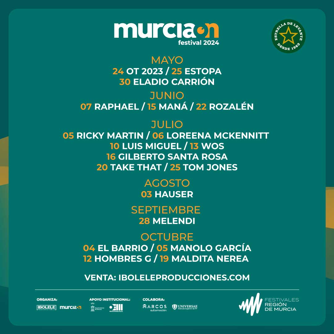 Artistas de primer nivel coparán la Plaza de Toros de Murcia con nombres tan potentes como Tom Jones, Take That, Maná, Estopa, WOS, Hombre G o Manolo García.