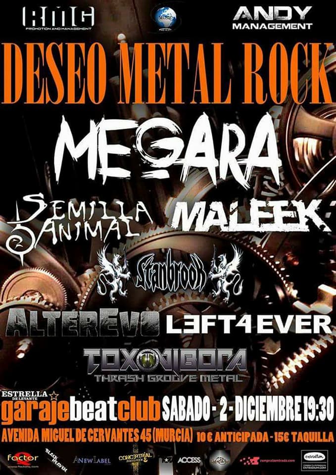 Acompañados de nuestros Maleek, que no paran un segundo con la gira de su último trabajo Despertares y Semilla Animal con El Tio del Saco, terminando el año de la forma más bestia que pueden ofrecernos. Directos desde Alicante llegan Standbrook, con la gira de su primer álbum homónimo. De Madrid también nos deleitarán las bandas Alterevo, con su CD Redefinido y Left4ever con Némesis, su primer larga duración. Y ya sólo nos quedan por mencionar (y no sin menos importancia) nuestros vecinos de Albacete, Toxovibora con su trabajo Primer ataque, el primero de la banda de Hellín.