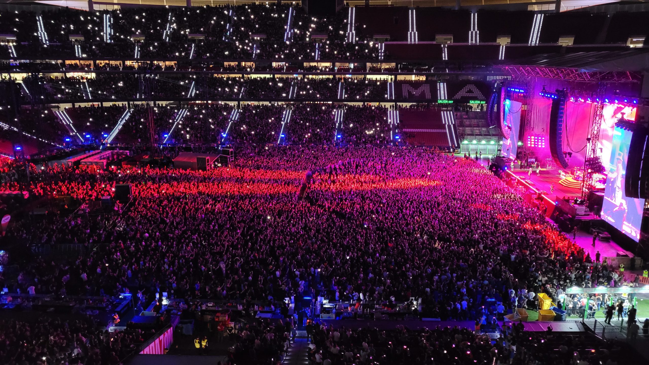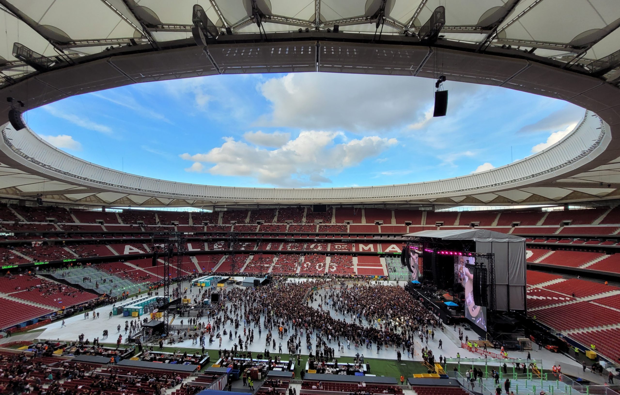 ¿He dicho ya que sonaba muy alto? Pues me quedo corto. Es la primera vez que en un segundo anfiteatro, a más de 50 metros del escenario, echaba en falta los tapones para los oídos que siempre llevo cuando me toca estar en foso. El sonido era doloroso por momentos (no de malo, de potente) y temí por un tinnitus. Encima, el técnico parecía seguir órdenes de subir el volumen en los gritos de Axl (que lejos de separarse el micro de la boca, se lo acercaba). Mención aparte, el estadio Metropolitano, que es muy bonito y muy cómodo, pero mejor ir a pista siempre porque el «semi techado» ovalado del estadio hace que en los anfiteatros más altos haya eco y se forma la temida «bola» de sonido.