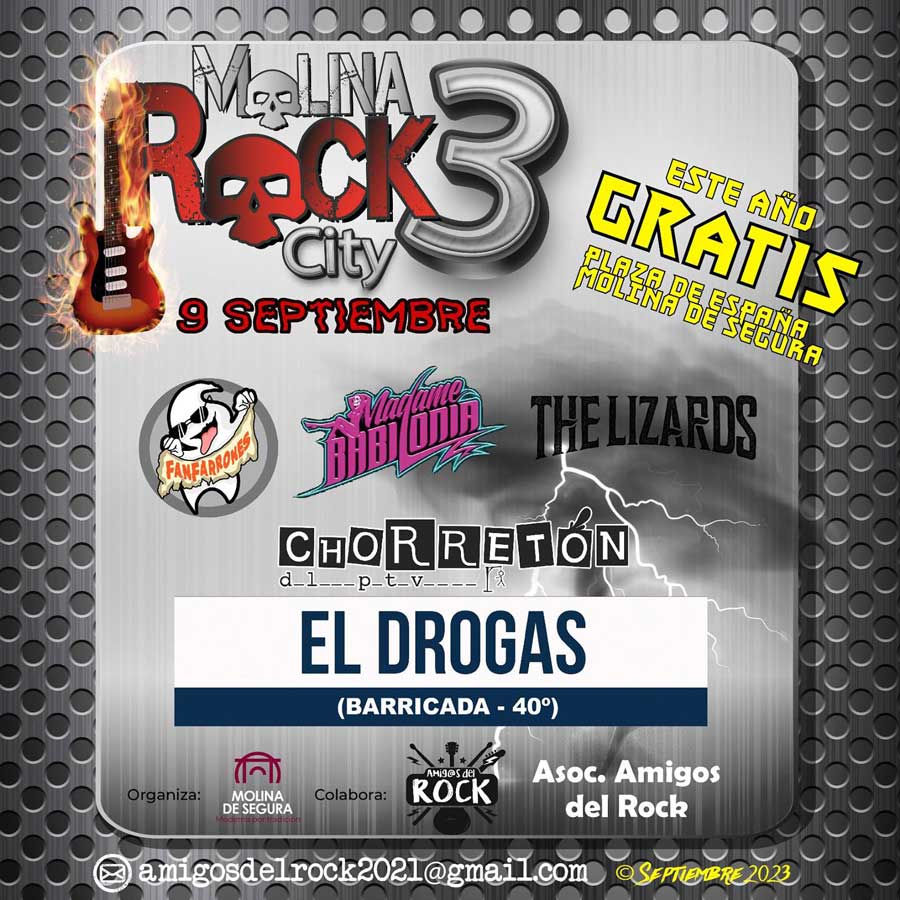 Molina Rock City, el festival de Molina de Segura (Murcia), celebra su tercera edición cambiando de formato. Tras dos ediciones en las que el festival ha tenido una duración de dos días, este año se reduce a una sola jornada. Pero no todo son malas noticias; y es que en esta ocasión el acceso será gratuito para todo aquel que quiera disfrutar de una buena noche de rock. Además, cuenta con la magnífica confirmación de El Drogas con su gira especial 40 aniversario de los míticos Barricada.