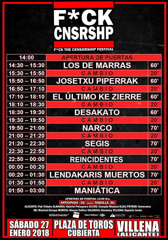 Estamos ya a muy pocos días de que se celebre la nueva edición del festival F*ck Cnsrshp este sábado 27 en la plaza de toros de Villena, la cual estará cubierta y tendrá zona de aseos de obra y barra de comida y bebida, guardarropa ¡y hasta tendremos calefacción! Todo un lujo para un día de festival por todo lo alto.