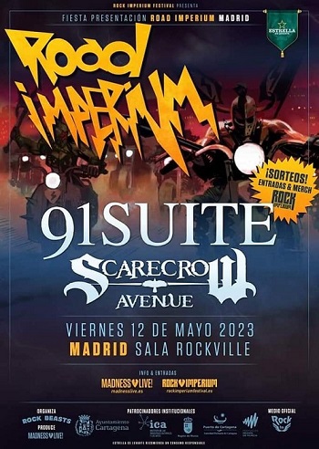 91 Suite y Scarecrow Avenue serán los encargados de la parte musical del evento, que tendrá lugar el viernes 12 de mayo en la madrileña sala Rockville. Aparte de estas dos jugosas y apetecibles actuaciones, habrá sorteos de abonos del festival y una tirada liminata del cómic del Rock Imperium firmada por sus autores.