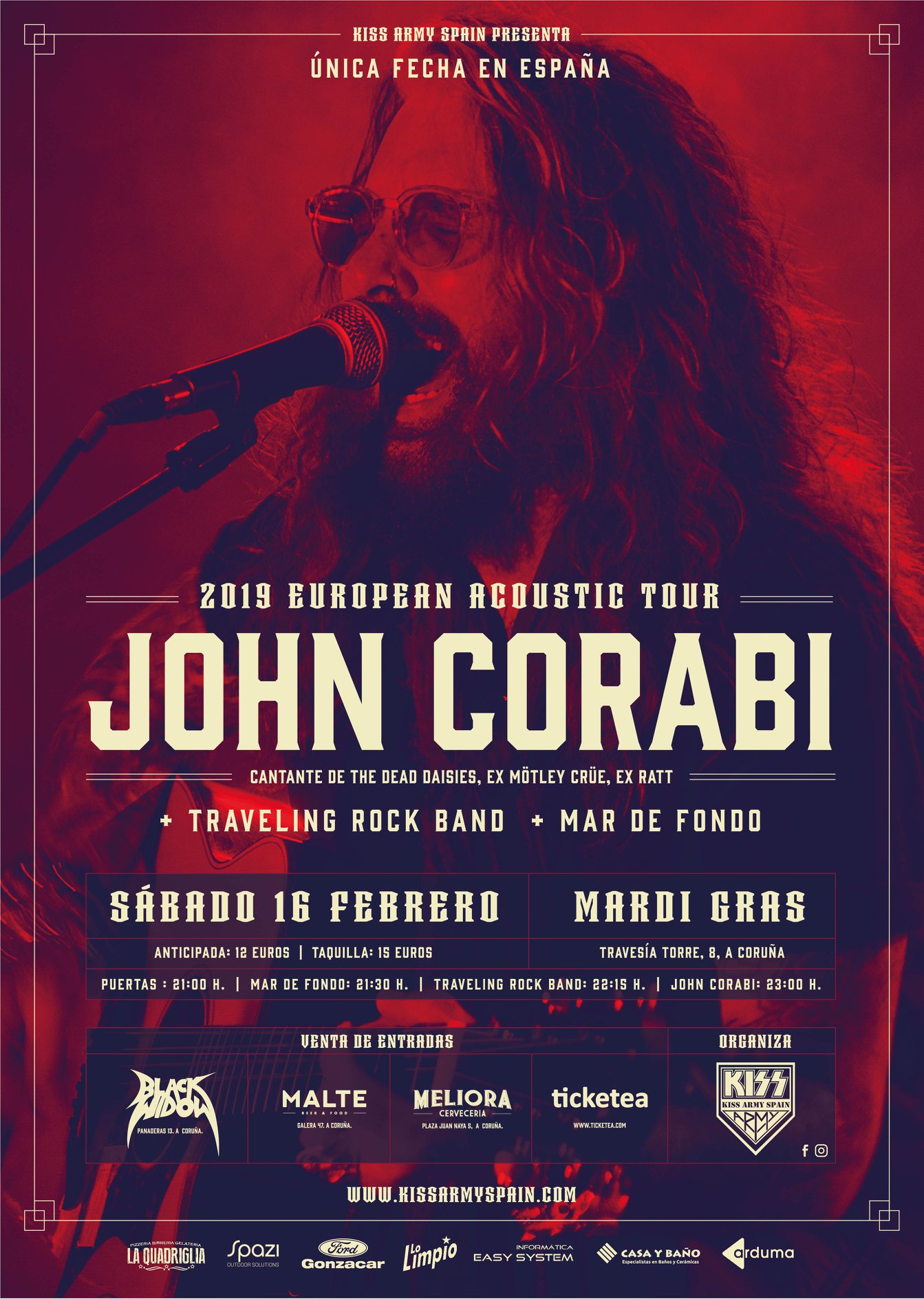 John Corabi, actualmente vocalista de The Dead Daisies y en su día de Mötley Crüe así como también fue partícipe en otras bandas como Ratt o The Scream, hará una gira europea en acústico durante enero y febrero de 2019. Esta gira tendrá paradas en diferentes países como Noruega, Finlandia, Alemania o Italia y tendrá su final en España, concretamente en la Sala Mardi Gras de A Coruña el sábado 16 de febrero.