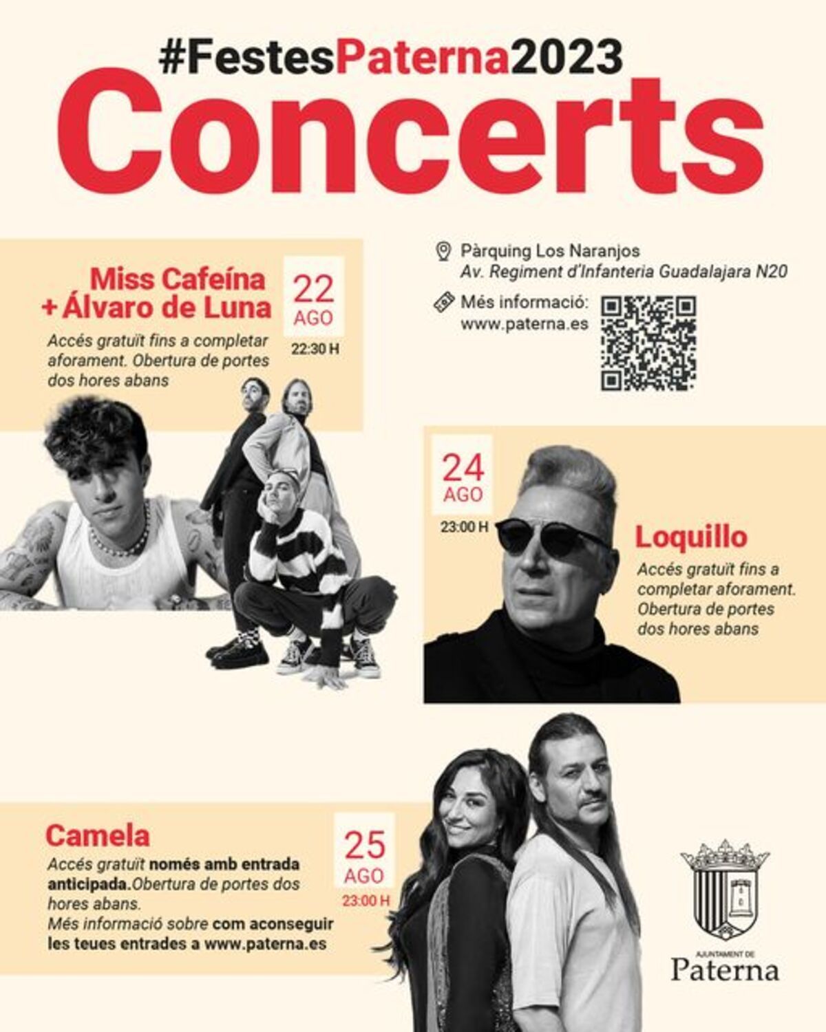 El Ayuntamiento de Paterna (Valencia) ya ha dado a conocer el cartel de los conciertos para las Fiestas Mayores 2023 que tendrán lugar este mes de agosto en el nuevo parking municipal de Los Naranjos, que cuenta con una capacidad para 8.000 personas y para este año el ayuntamiento apuesta por varios estilos musicales con el fin de llegar a todos los públicos.