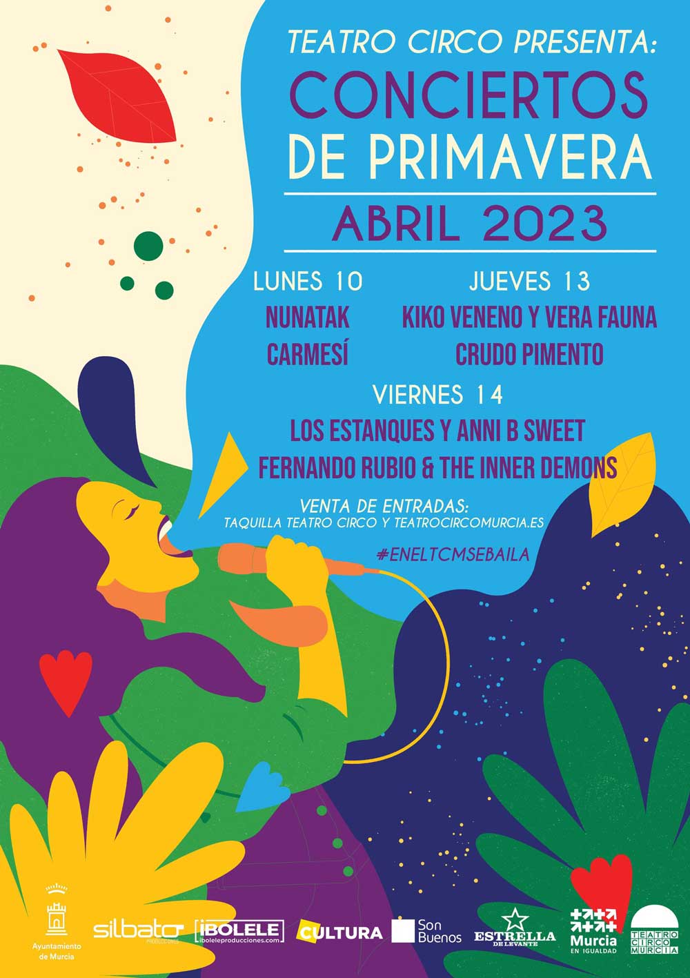 Vuelven los Conciertos de Primavera del Teatro Circo de Murcia, será durante la semana de fiestas de primavera en murcia, los días 10, 13 y 14 de abril. Un evento muy especial en el que el Teatro retira sus asientos, instala barras y lo convierte en una gran pista en la que disfrutar de grupos de la talla de Kiko Veneno, Crudo Pimento o Los Estanques & Anni B Sweet. Además, está la opción de disfrutar de los conciertos sentando, reservando entrada en los anfiteatros.