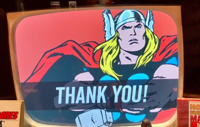 El recorrido empieza con un vídeo que nos cuenta la historia desde Capitán América a los Vengadores sin olvidar a Spiderman. Todos los personajes son citados de normal a súper héroe, como los rock stars.