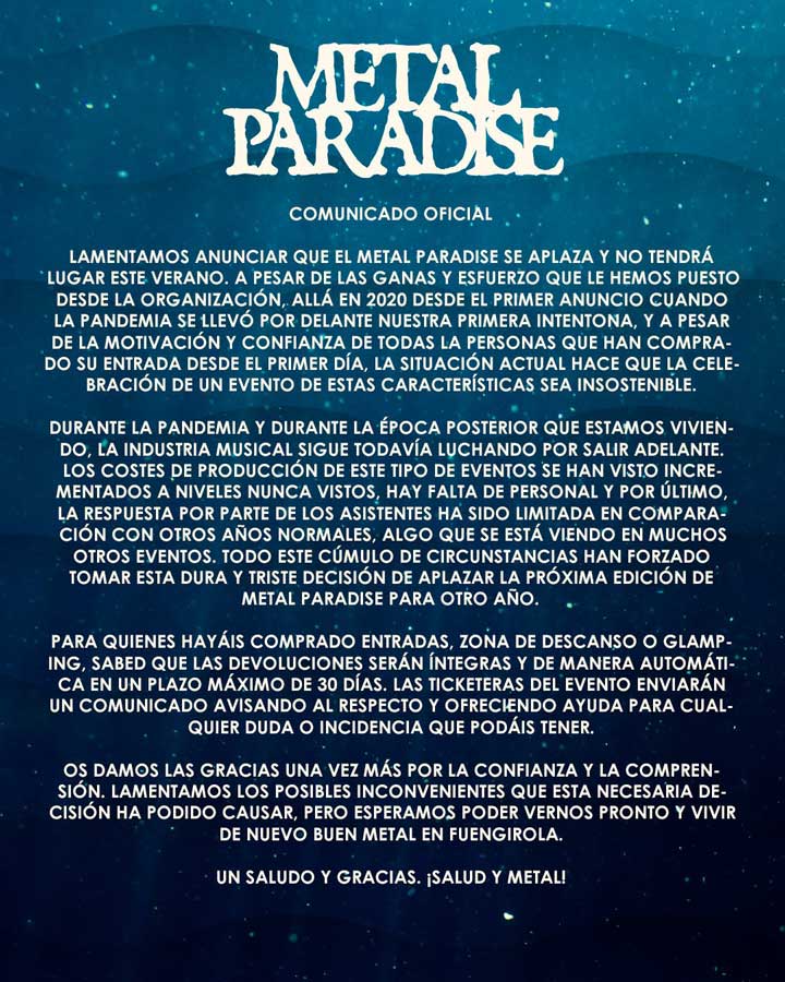 Metal Paradise aplazado: Comunicado oficial