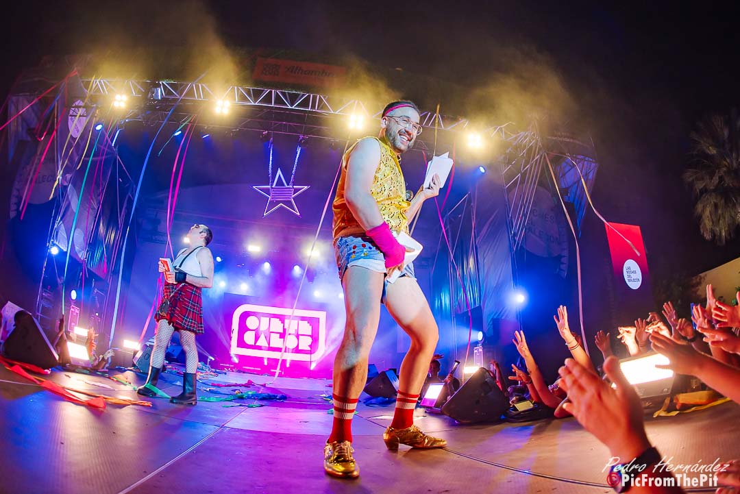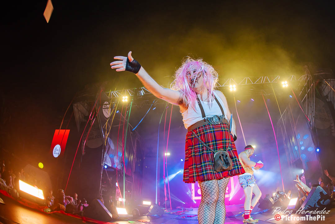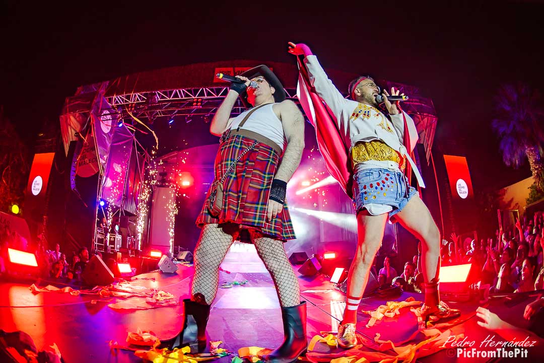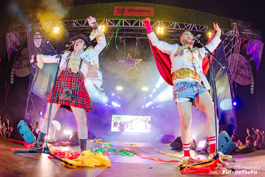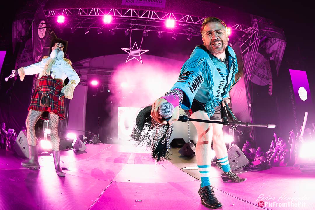 Ahora suena Barcelona de Montserrat Caballé y Freddie Mercury… «Hay que tenerlos muy gordos para empezar con esa canción» dice un paisano del público. Coincido plenamente. Y puestos a ofender a los «ofendiditos» añaden a la herejía inicial el Bienvenidos de Miguel Ríos pero con una pequeña variación: Buenas noches, bienvenidos, hijos del subnopop, que sirvió de intro para activar al público y desvelar el «outfit» con el que Carlos y Aníbal nos iban a sorprender (que rivaliza con la Pedroche en Nochevieja).