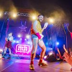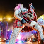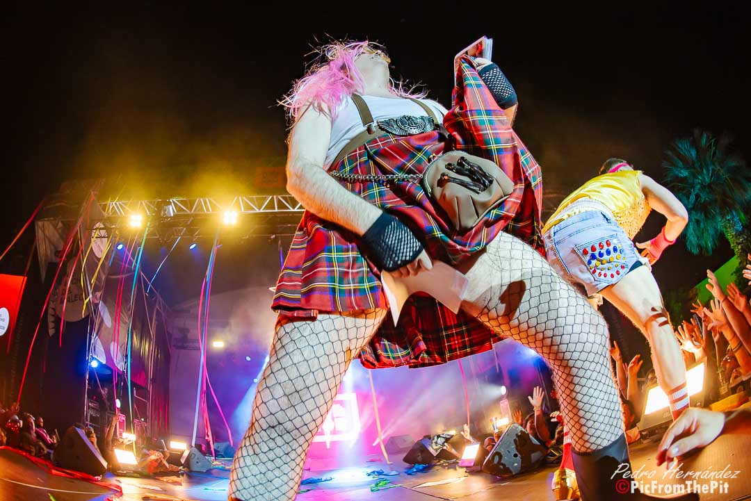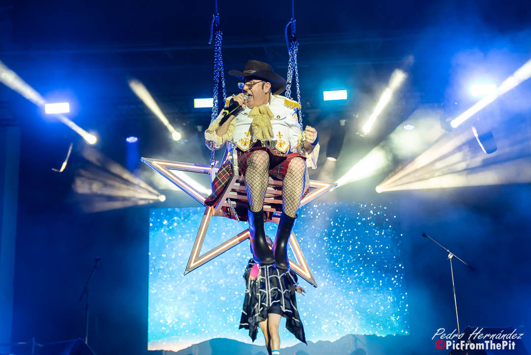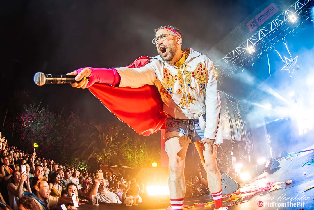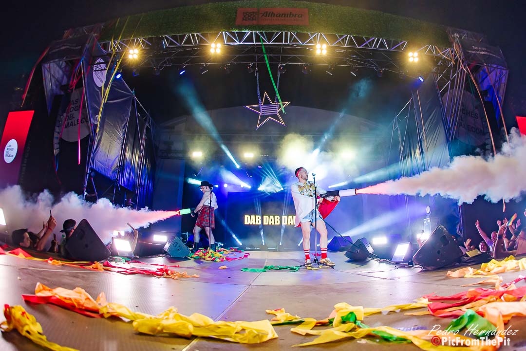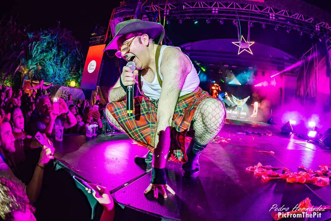 Ahora suena Barcelona de Montserrat Caballé y Freddie Mercury… «Hay que tenerlos muy gordos para empezar con esa canción» dice un paisano del público. Coincido plenamente. Y puestos a ofender a los «ofendiditos» añaden a la herejía inicial el Bienvenidos de Miguel Ríos pero con una pequeña variación: Buenas noches, bienvenidos, hijos del subnopop, que sirvió de intro para activar al público y desvelar el «outfit» con el que Carlos y Aníbal nos iban a sorprender (que rivaliza con la Pedroche en Nochevieja).