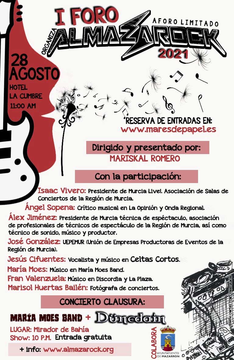 El primer Foro Almazarock se celebrará a las 11 de la mañana del próximo 28 de agosto en el hotel La Cumbre del puerto de Mazarrón (Murcia). Mientras que el concierto será el Mirador de Bahía, Cabezo de la Reya de la misma localidad murciana.