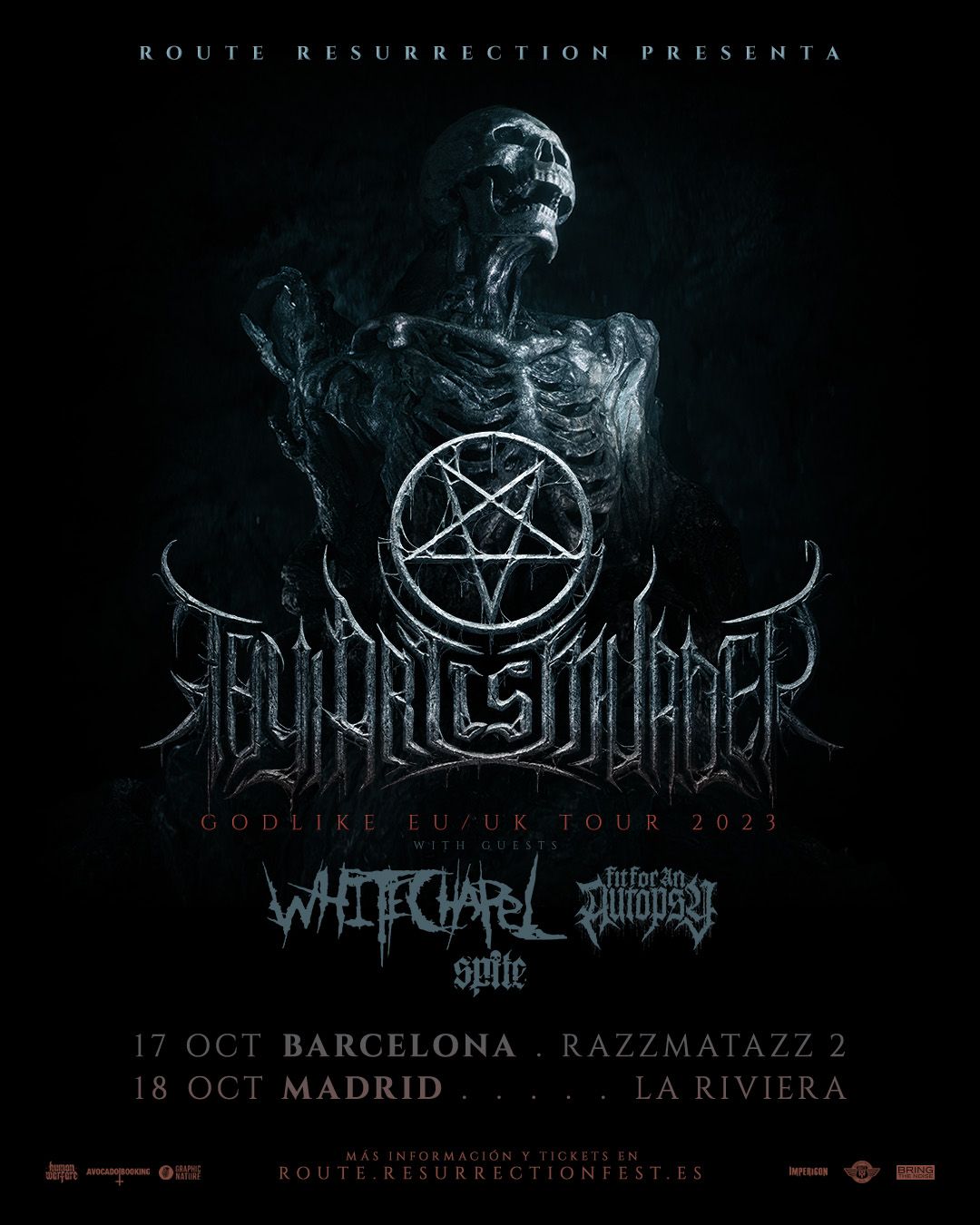 Thy Art Is Murder, reyes absolutos del deathcore, visitarán España durante el mes de octubre encabezando un nuevo y potente Route Resurrection Fest. Eso sí, no lo harán solos. Los días 17 (Barcelona) y 18 (Madrid) de octubre, la banda australiana se acompañará de Whitechapel, Fit for an Autopsy y Spite. De este modo, este concierto promete ser uno de los más potentes del género de todo el 2023.