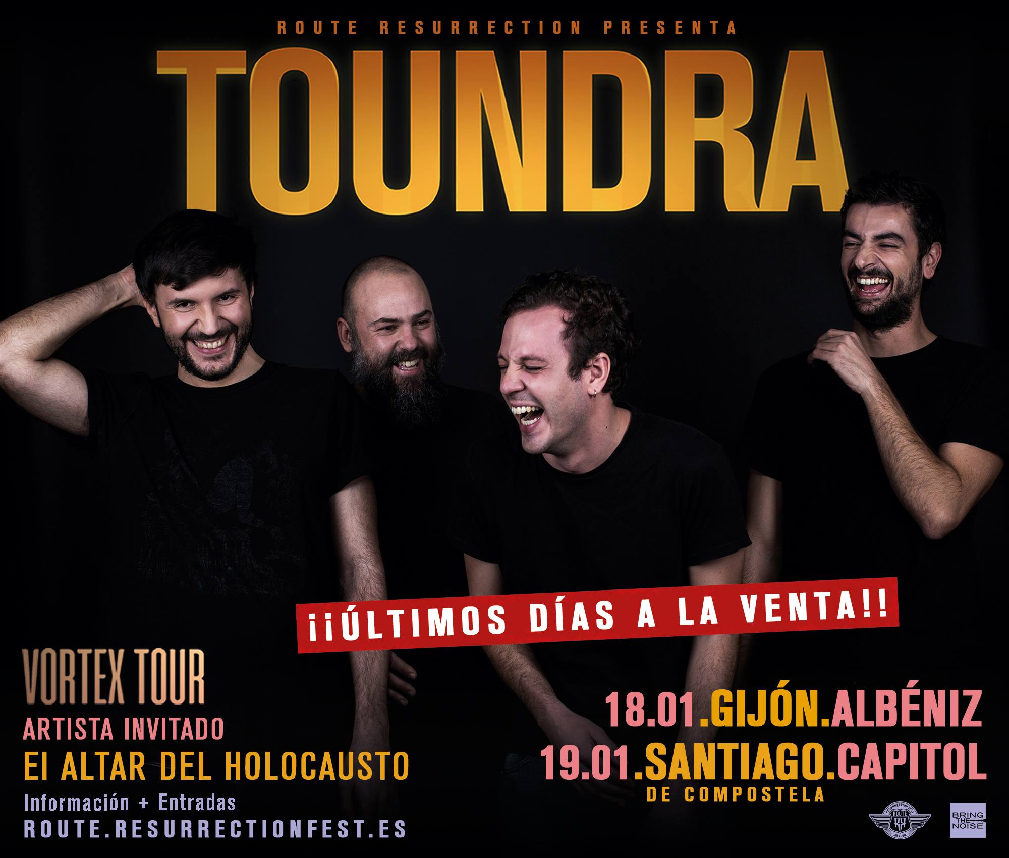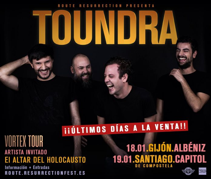 Se trata de dos conciertos, en Gijón y Santiago de Compostela respectivamente, donde los madrileños Toundra presentarán su último trabajo ‘Vortex‘ tras hacerlo en numerosas fechas por todo el país y justo antes de salir a Europa durante todo el mes de febrero. Pero no estarán solos, ya que esta velada de post-rock instrumental la completarán El Altar Del Holocausto, a quienes Rock Culture hemos tenido el placer de entrevistar y podéis conocer un poco más sobre ellos aquí.