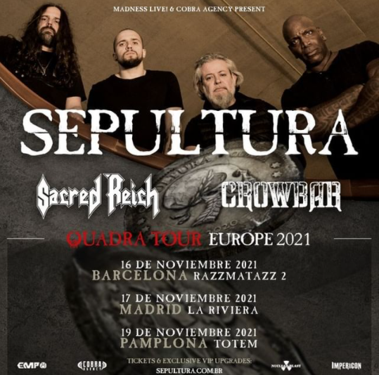 El próximo año podremos disfrutar de muchas giras pero vamos a hablaros de una de las más esperadas. De la mano de Madness Live en noviembre podremos ver ni más ni menos que a Sepultura acompañados de Sacred Reich y Crowbar. Un trio demoledor que los amantes del metal no querrán perderse en Madrid, Barcelona y Pamplona.
