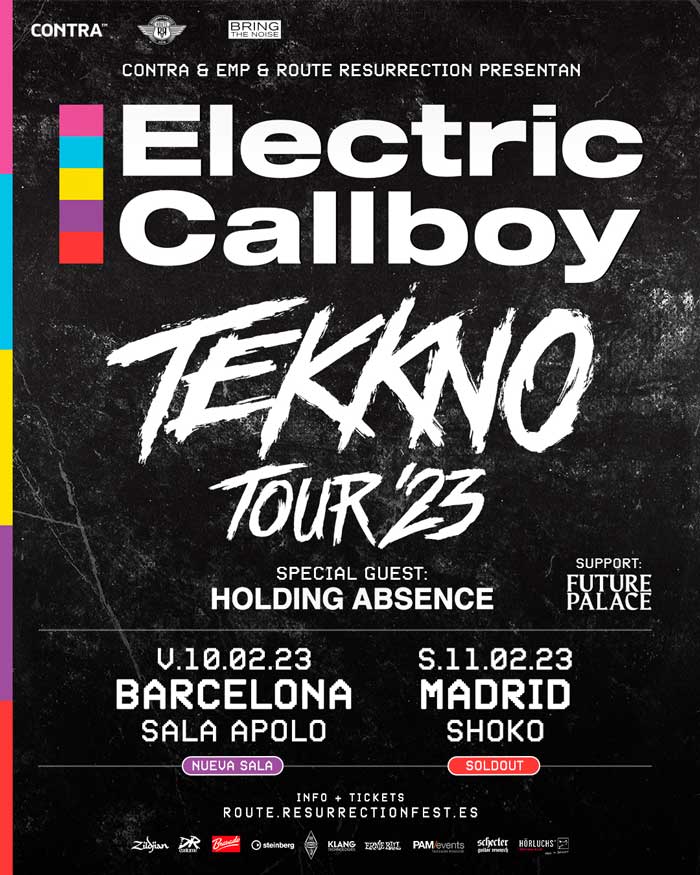 Estos alemanes traerán consigo a los galeses Holding Absence, quienes presentarán su nuevo EP The Lost & The Longing (2023) y nos traerán su personal estilo definido dentro de los límites del post-hardcore y rock alternativo. Aunque no serán los primeros en abrir el espectáculo de Electric Callboy, ya que al cartel se han unido los también alemanes Future Palace. Este trío post-hardcore de Berlín presentará su nuevo álbum Run (2022).