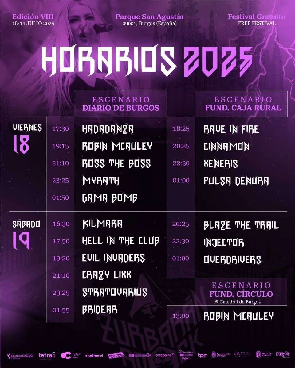 Bandas como Stratovarius, Myrath, Ross the Boss o Crazy Lixx entre otras muchas. Robin McAuley además de actuar en la jornada del viernes, el sábado ofrecerá un show acustico junto a la Catedral de Burgos, planazo en el centro histórico.