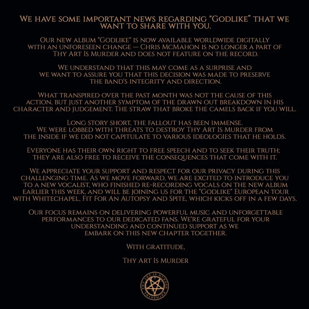 Coincidiendo con el inicio de su gira junto a Whitechapel, Fit For An Autopsy y Spite ayer en Oberhaussen, Alemania, la banda presentó a Miller como nuevo frontman, quien, además de acompañar a Thy Art Is Murder durante la gira europea, fue el encargado de regrabar las voces de Godlike, el nuevo trabajo de estudio de la banda, tras la expulsión de CJ McMahon.