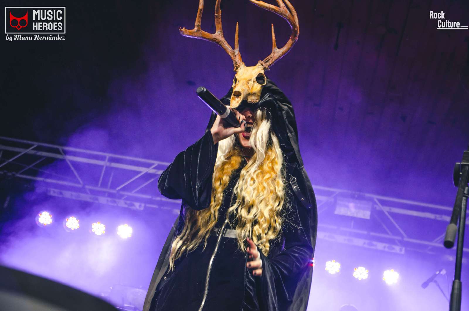 A continuación, y tras el tiempo exacto de cambio progamado en los horarios del festival, la banda barcelonesa Astray Valley hacía acto de presencia, con su vocalista Clau Violette al frente enfundada en una negra capa cuya capucha estaba coronada por el cráneo y cornamenta de un ciervo.
