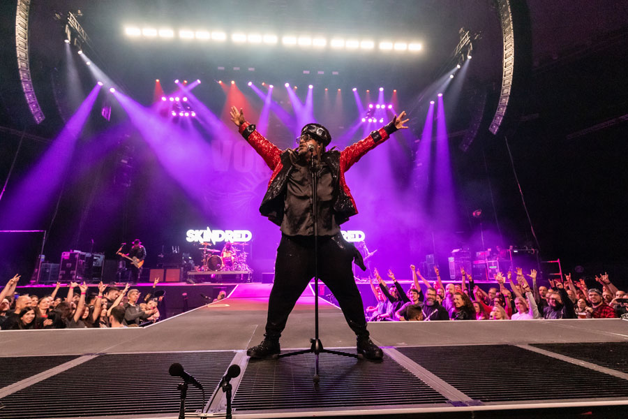 Tras la media hora ofrecida por el quinteto estadounidense, llegó el turno de Skindred. La banda de raggametal (definición personalísima) también venía cronometrada, sólo contaban con 45 minutos, pero fue intensa desde la primera nota de Under Attack, con la que se metieron a todo el público en el bolsillo.